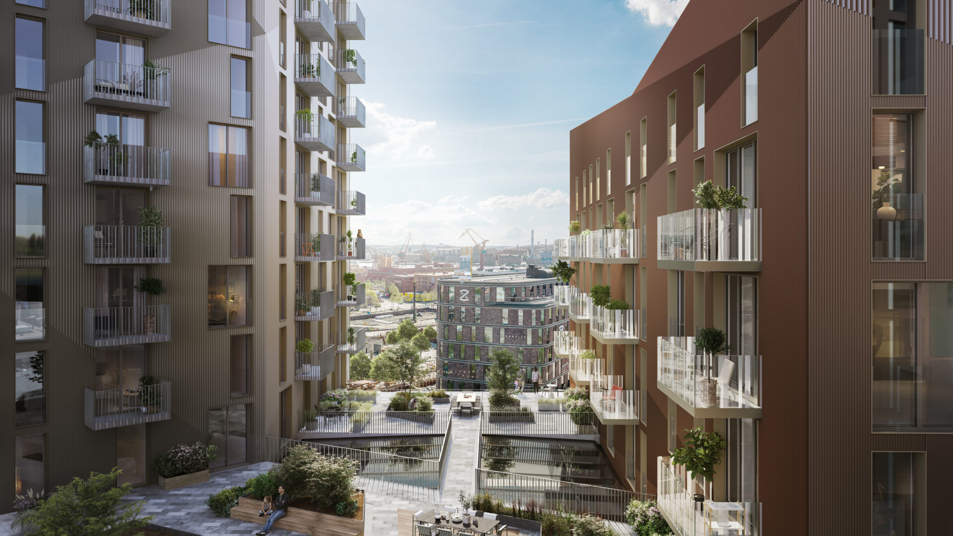 Taket på lågdelen kan utvecklas till en gemensam terrass med plats för grönska och sociala ytor. Läget i Karlastaden på Lindholmen ger närhet till kommunikationer, service och stadsliv.